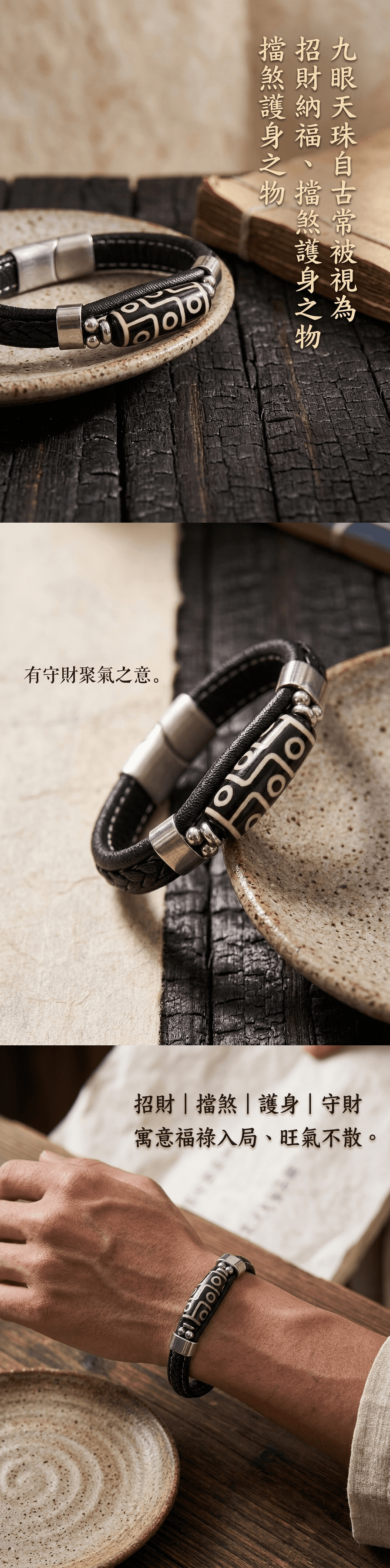 藏式九眼天珠磁吸扣皮革編織手鍊「富貴長青」【祈福加持】