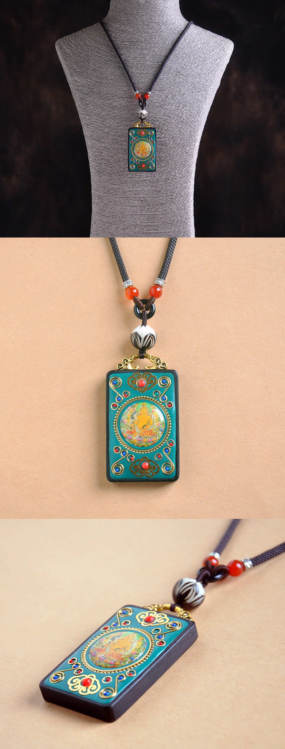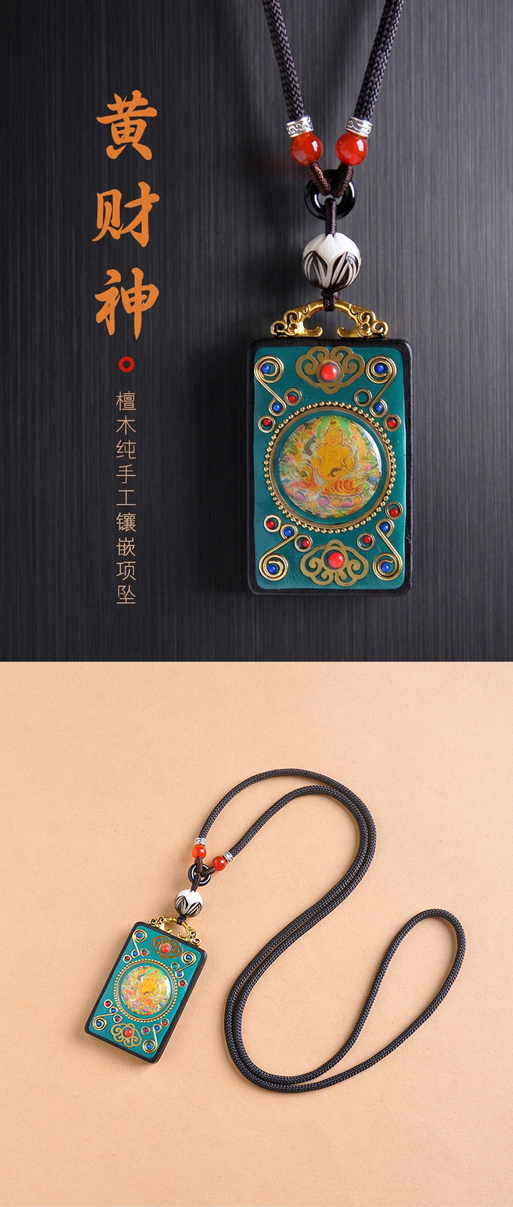 黃財神檀木唐卡吊墜手工項鍊「招財系列」【祈福加持】
