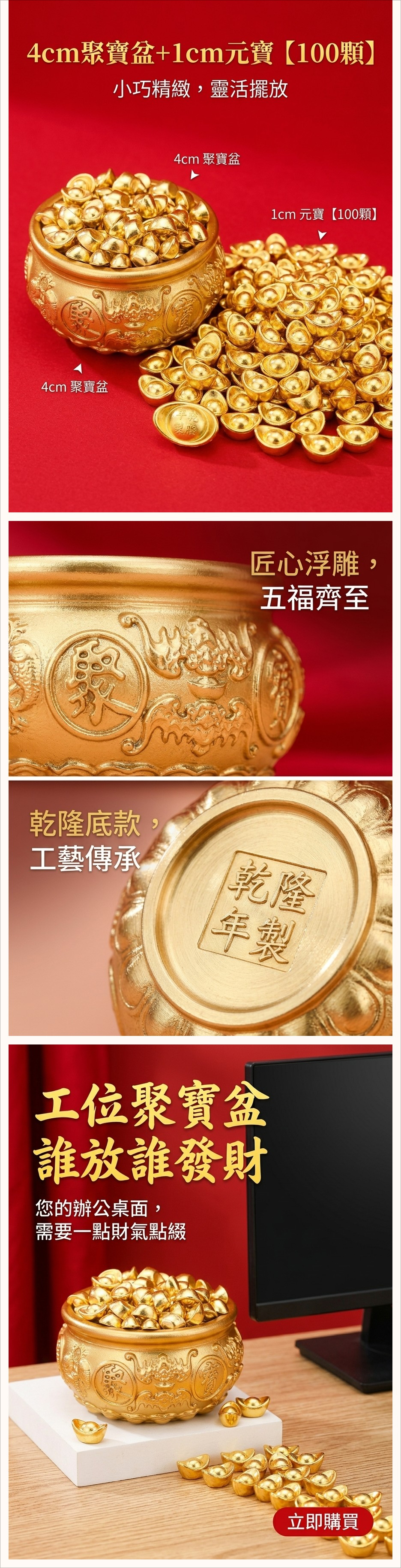 黃銅五福聚寶盆招財盆擺件「招財系列」4cm聚寶盆 + 1cm元寶【100顆】